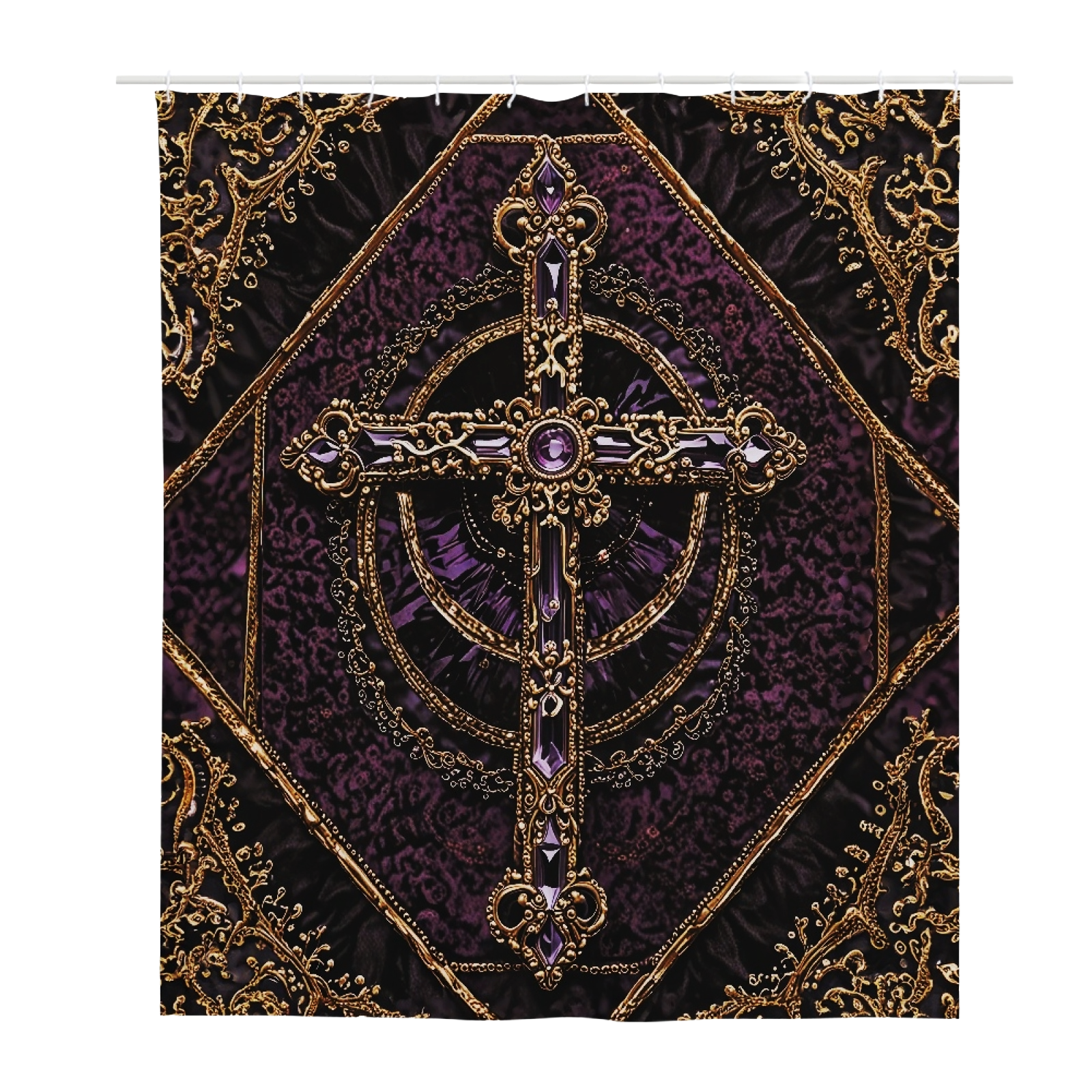 Duschdraperi i luxuösa lila toner, prydd med ett guldbroderat korstryck med kristaller och guldbroderade detaljer. Ta ett heligt bad och bjud in nattens mystik i gotisk lyx!