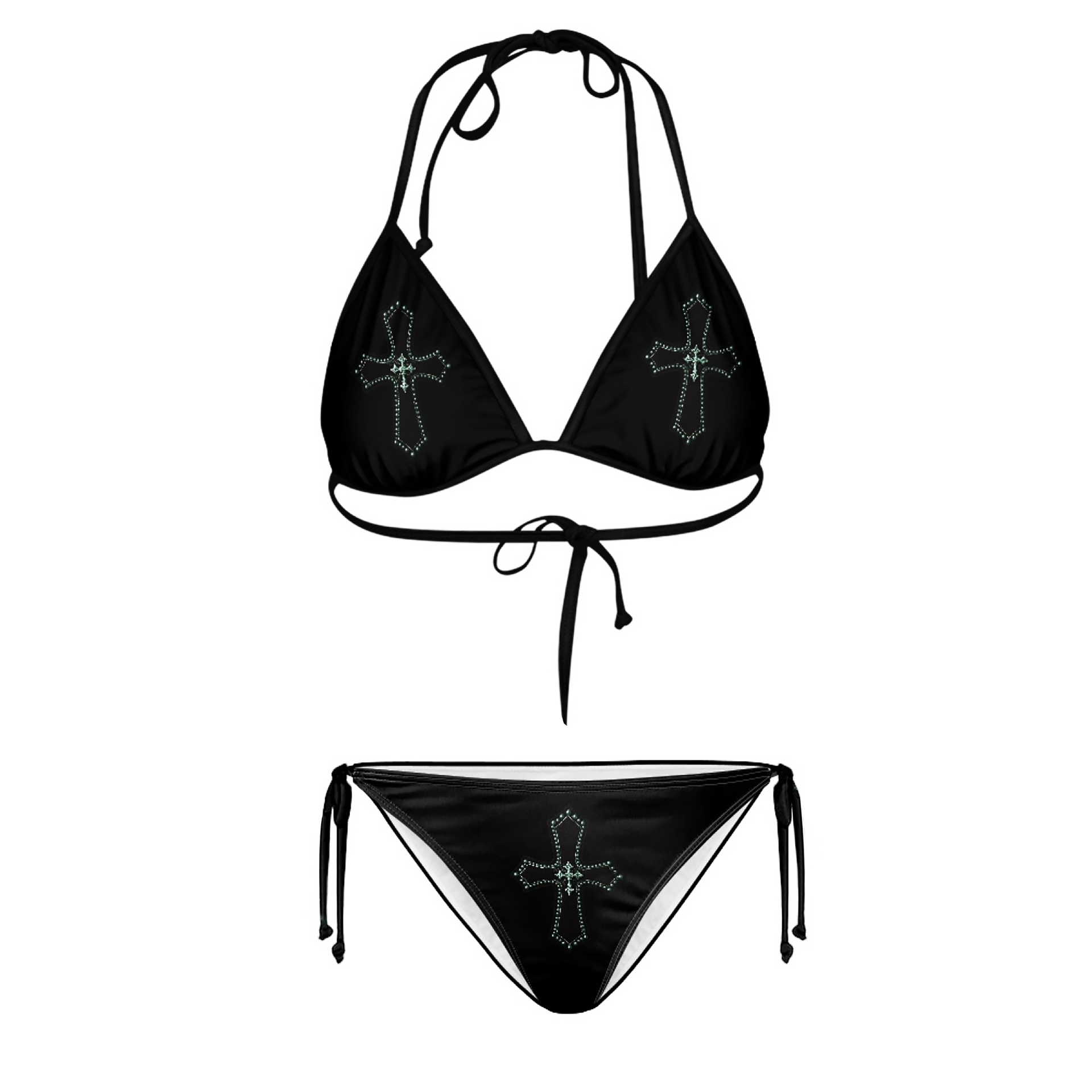 Svart och mintgrön trekants-bikini med tryck av metalliskt mintgrönt kors med små pärlor och litet kors inuti. Överglänsa solen på stranden och låt skuggorna dansa!