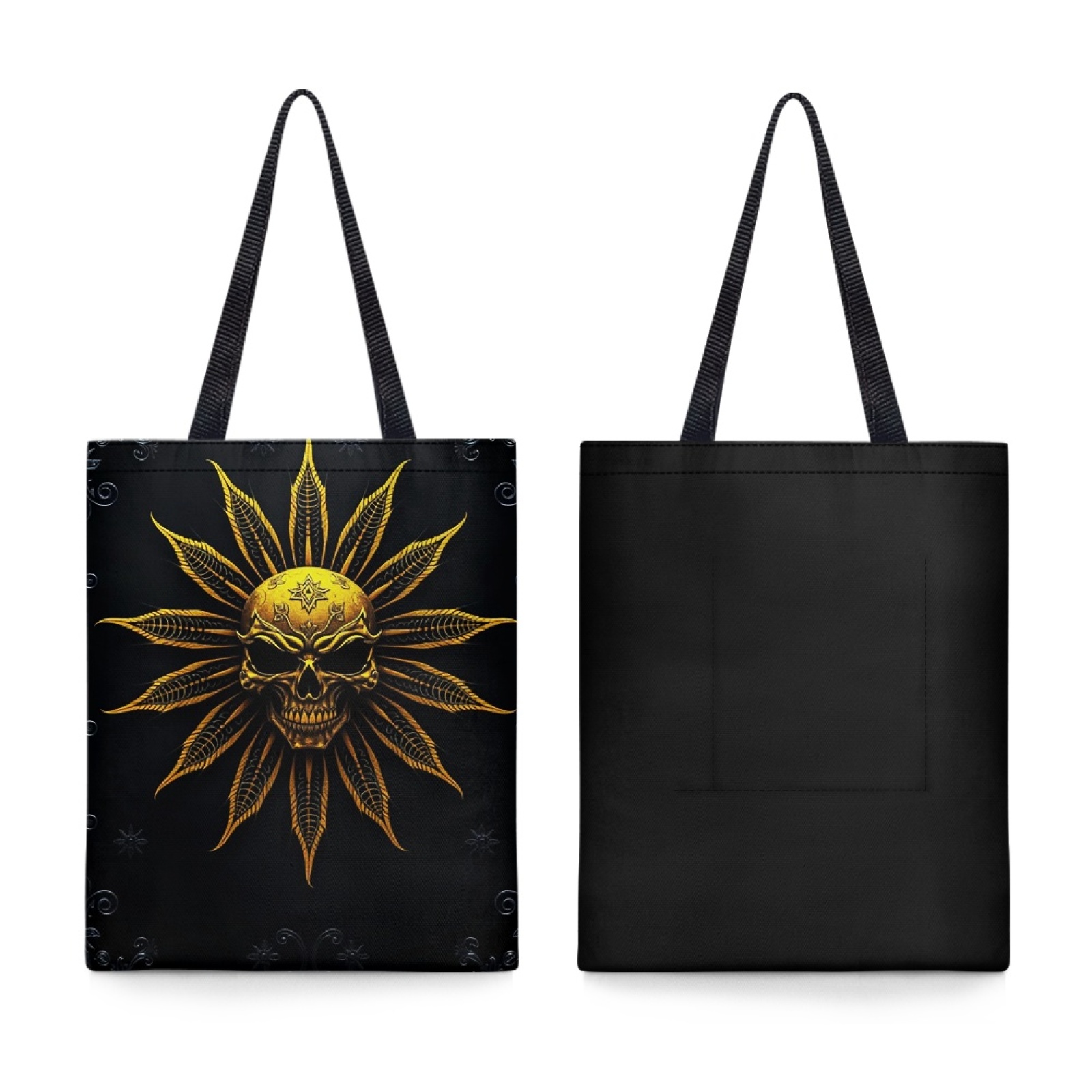 Svart tygväska med tryck av en guld döskalle omringar av blomblad. Praktfull ockult elegans - som en mystisk nattlig blomning som skimrar i mörkret med gyllene kraft i stilla magi.