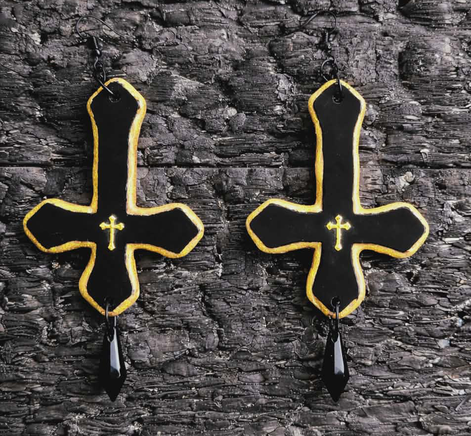 Black earrings with gold trim, a small gold cross in the center and an elegant drop detail - dark luxury with a subtle sacred touch