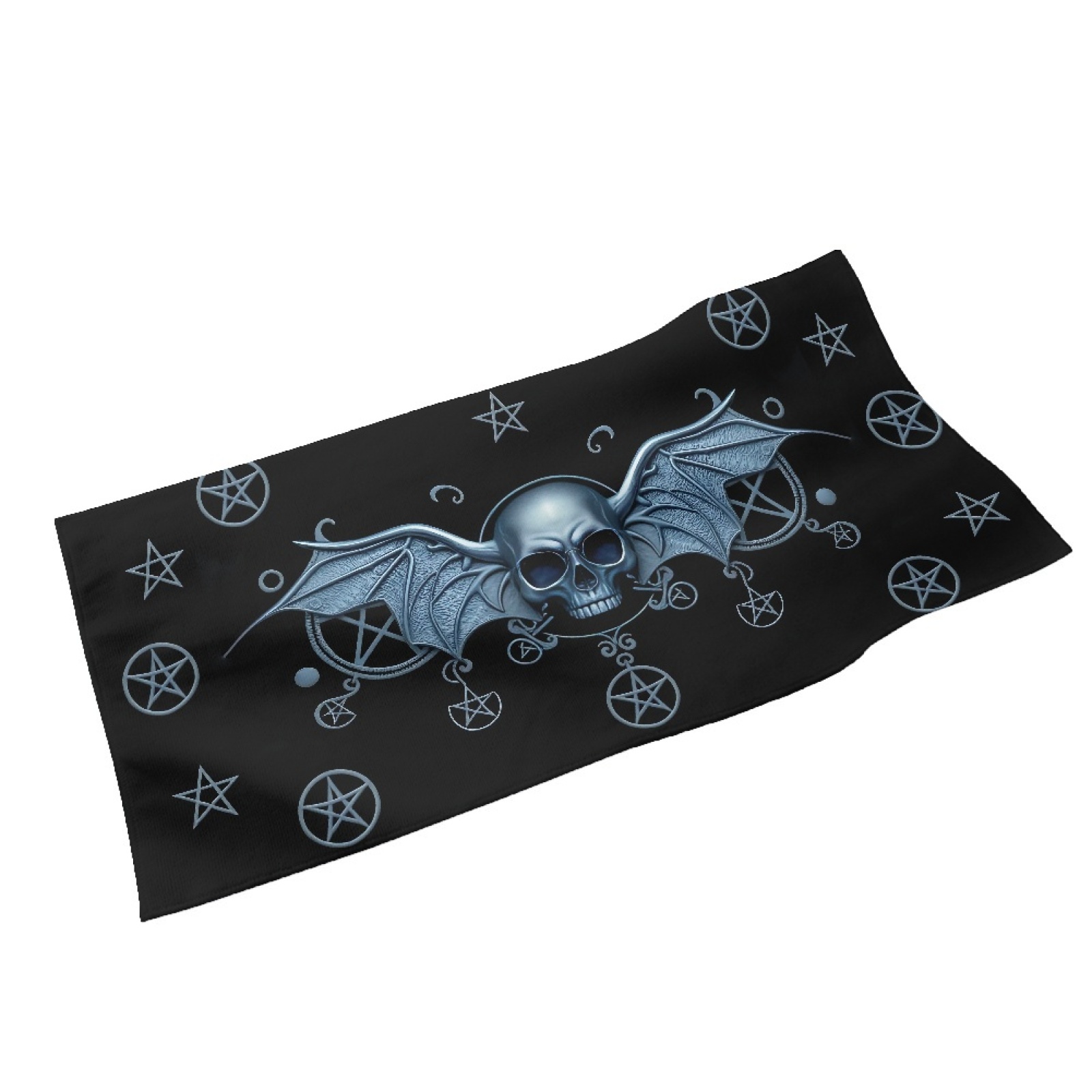 Sanctum Mortum är en svart handduk som pryds av ett tryck av en döskalle och pentagram i ljusblått, som skimrar kallt mot mörkret.