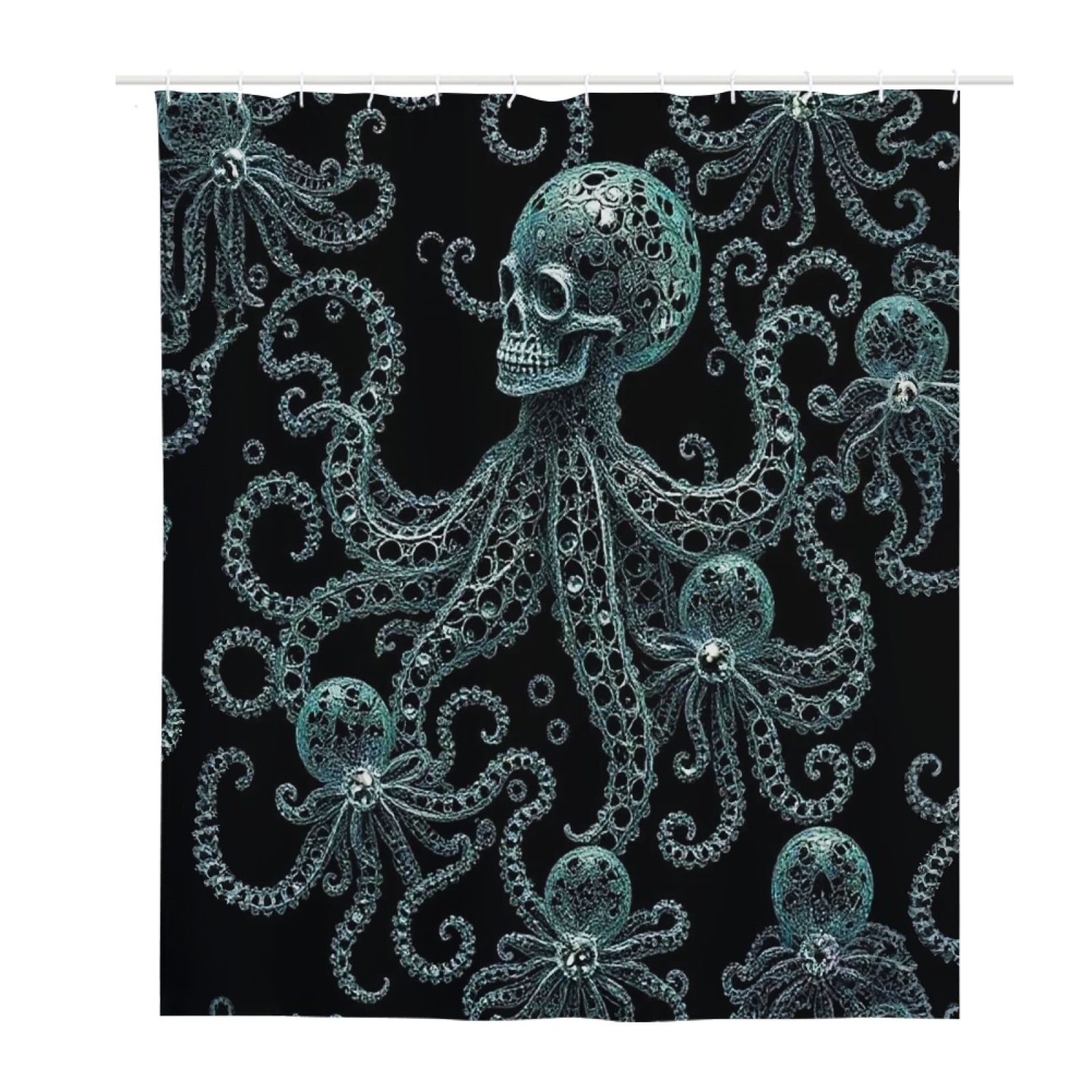 Svart duschdraperi prytt med ett skimrande grönt dödskalle-bläckfisktryck. Ett mörkt och förhäxat verk för badrum där skuggorna lever.