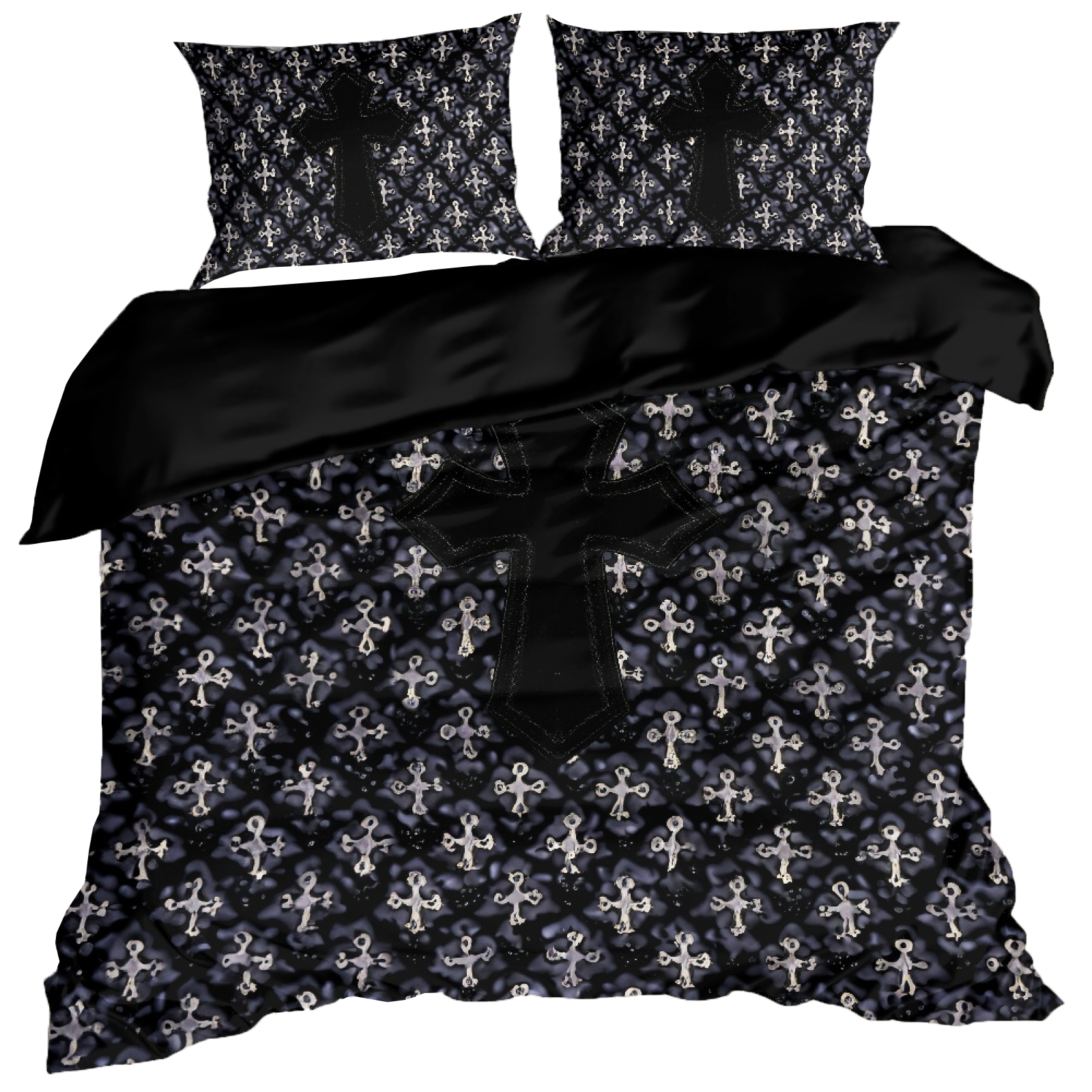 Tryck av av små, gyllene kors och kontrasterande svarta tygpatcher som skapar ett sofistikerat mönster med gotisk och ceremoniell känsla. Sov omsluten av helighet, lyx och nattens mystik!